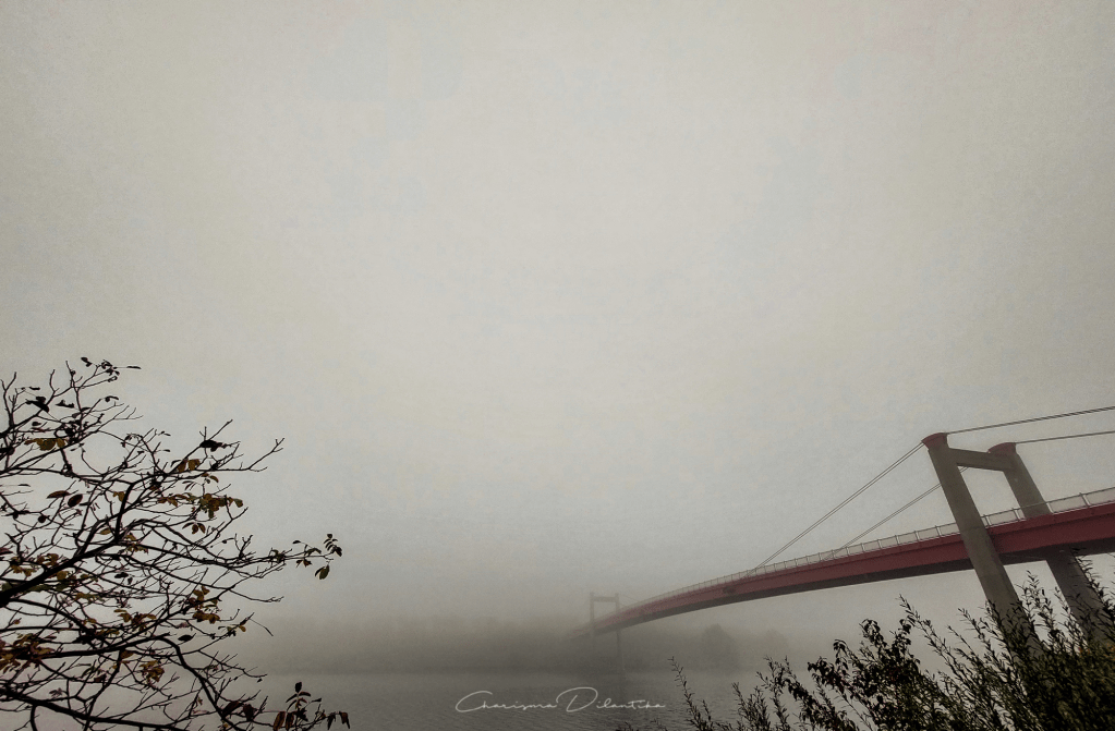 Once upon a crisp morning among thick fog and grayish landscape, lies a bold red bridge over the Danube, as the main connection between two main land.