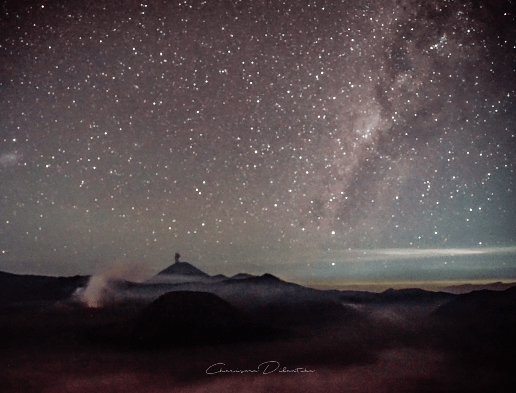 It was pitch black and freezing, after a while the fog got thin and there- the three mountains, Bromo, Batok, and Semeru- appeared, blowing some steam with milky way on the background.